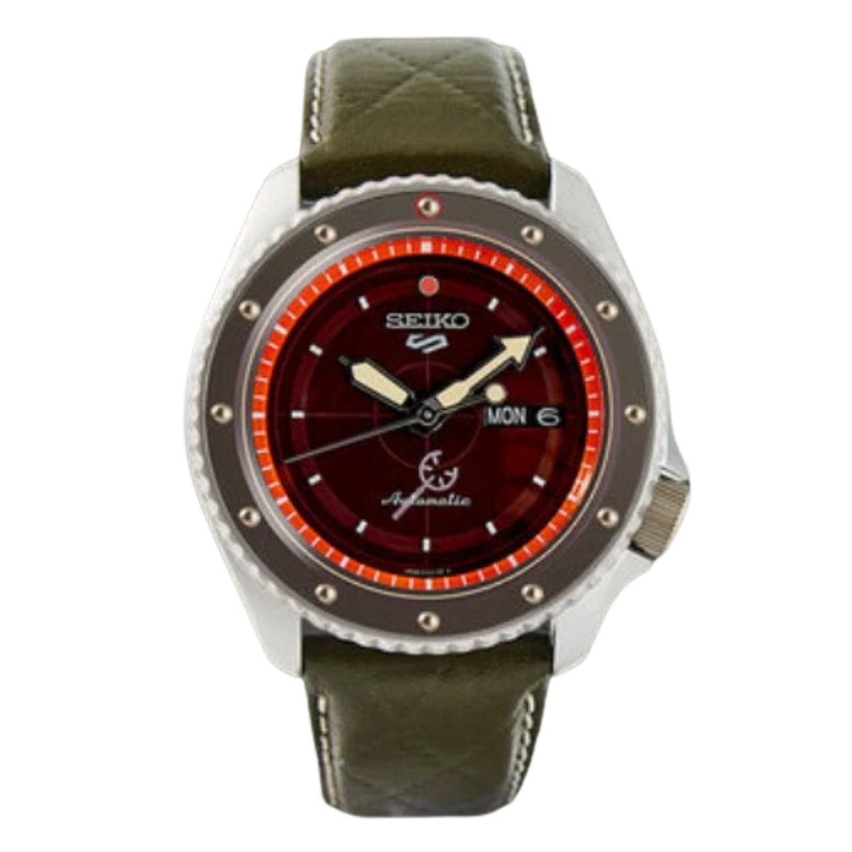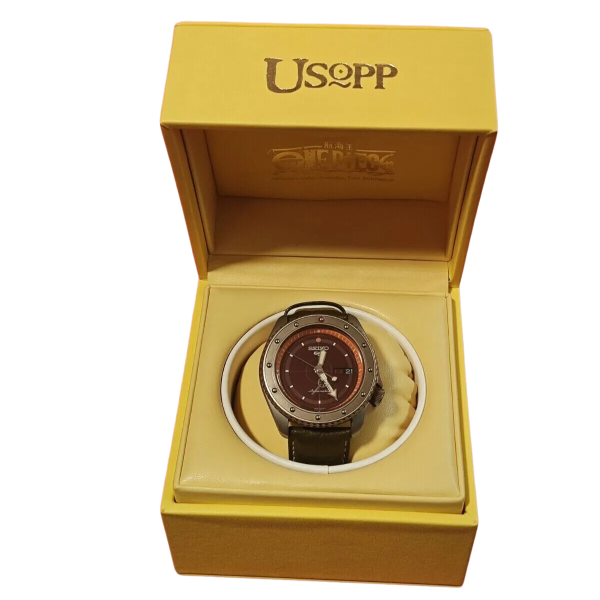 The Seiko 5 Sports x One Piece Usopp Limited Edition SRPF59K1 is a collector's dream and a high-quality timepiece. This special edition watch boasts a durable stainless steel case, a comfortable calfskin leather band, and a Hardlex crystal. The red dial features LumiBrite hands and markers for excellent visibility in any condition. Powered by the reliable 4R36 automatic movement with manual winding capability, this watch offers accurate timekeeping and a day/date display. With its 100-meter water resistance and unique One Piece-inspired design elements, the SRPF59K1 is a treasure for any watch enthusiast.