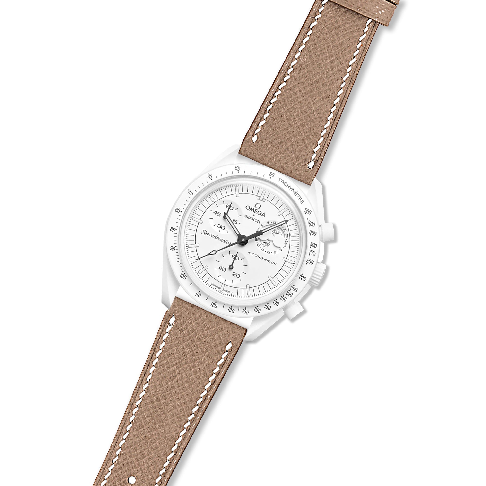 Elevate your Omega x Swatch Moonswatch Mission to the Moonphase - Full Moon with a touch of French elegance. Our Epsom Calfskin Leather Strap, handcrafted from premium leather sourced from the renowned Tanneries Du Puy, adds a sophisticated and refined touch to your Bioceramic timepiece.