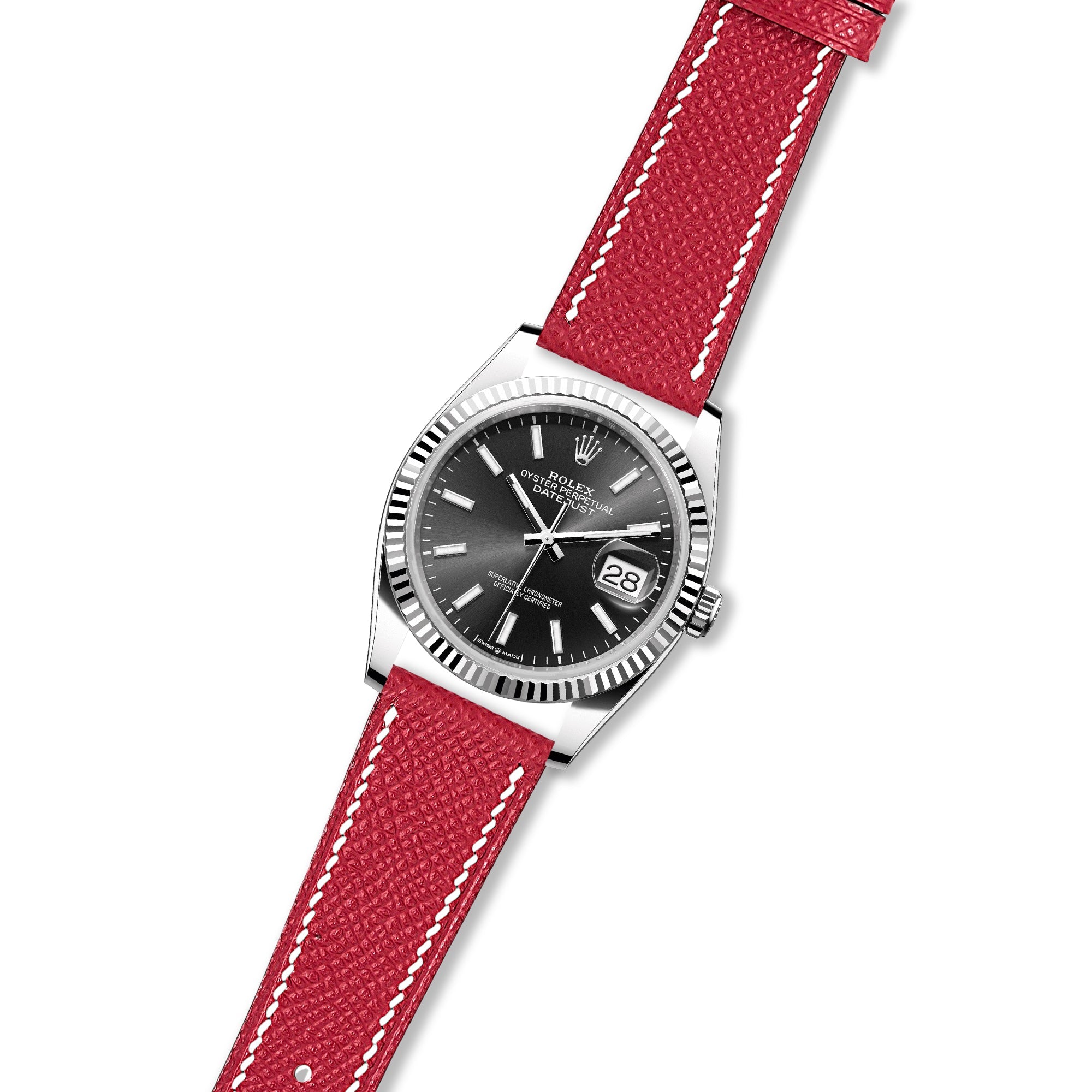 Transform your Rolex Datejust with the refined elegance and exceptional comfort of our handcrafted Epsom calfskin leather watch strap. Sourced from the renowned Tanneries Du Puy in France, this premium strap features a distinctive embossed hatch grain pattern and remarkable durability, making it the perfect complement to your cherished timepiece.