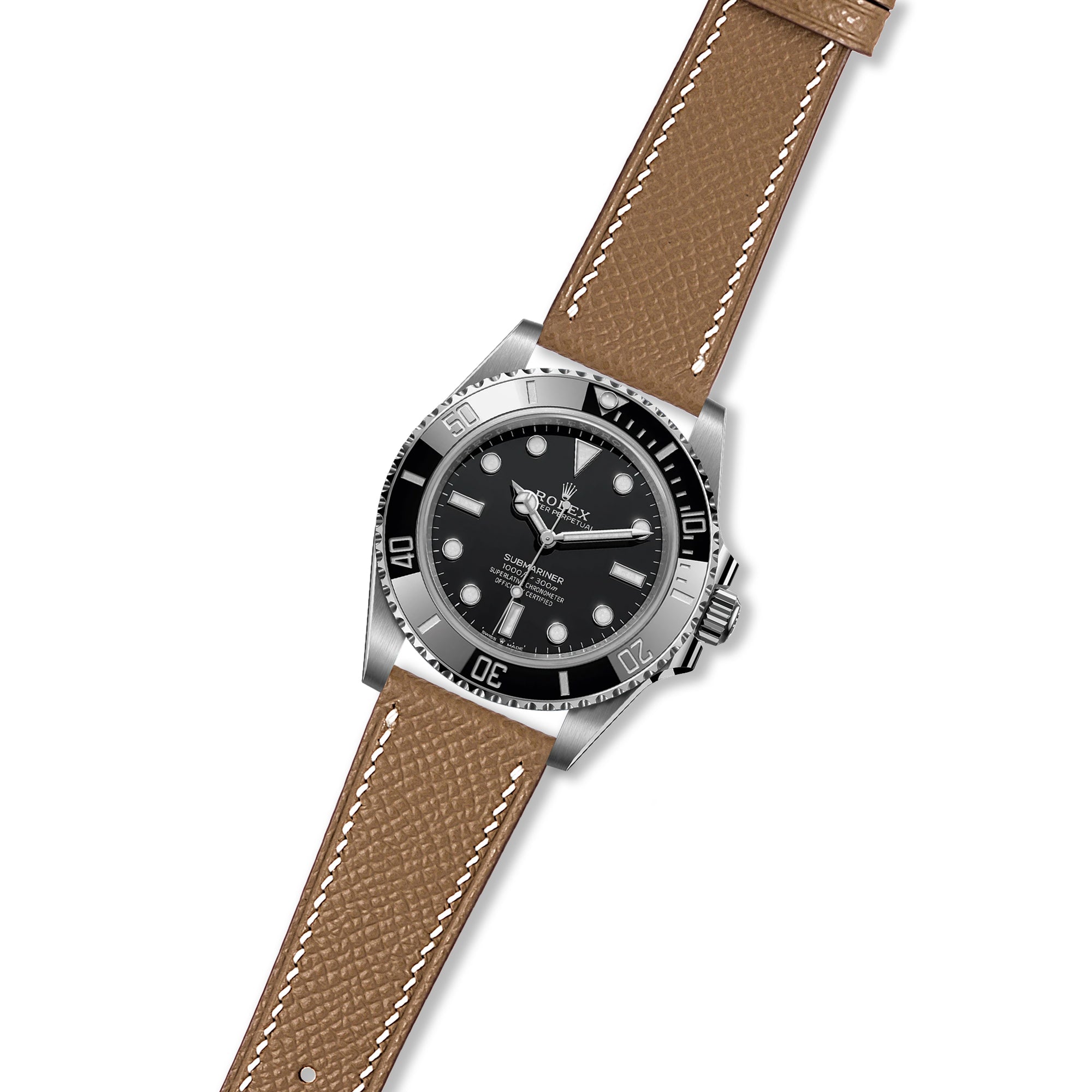 Transform your Rolex Submariner 40mm with the refined elegance and exceptional comfort of our handcrafted Epsom calfskin leather watch strap. Sourced from the renowned Tanneries Du Puy in France, this premium strap features a distinctive embossed hatch grain pattern and remarkable durability, making it the perfect complement to your iconic dive watch.