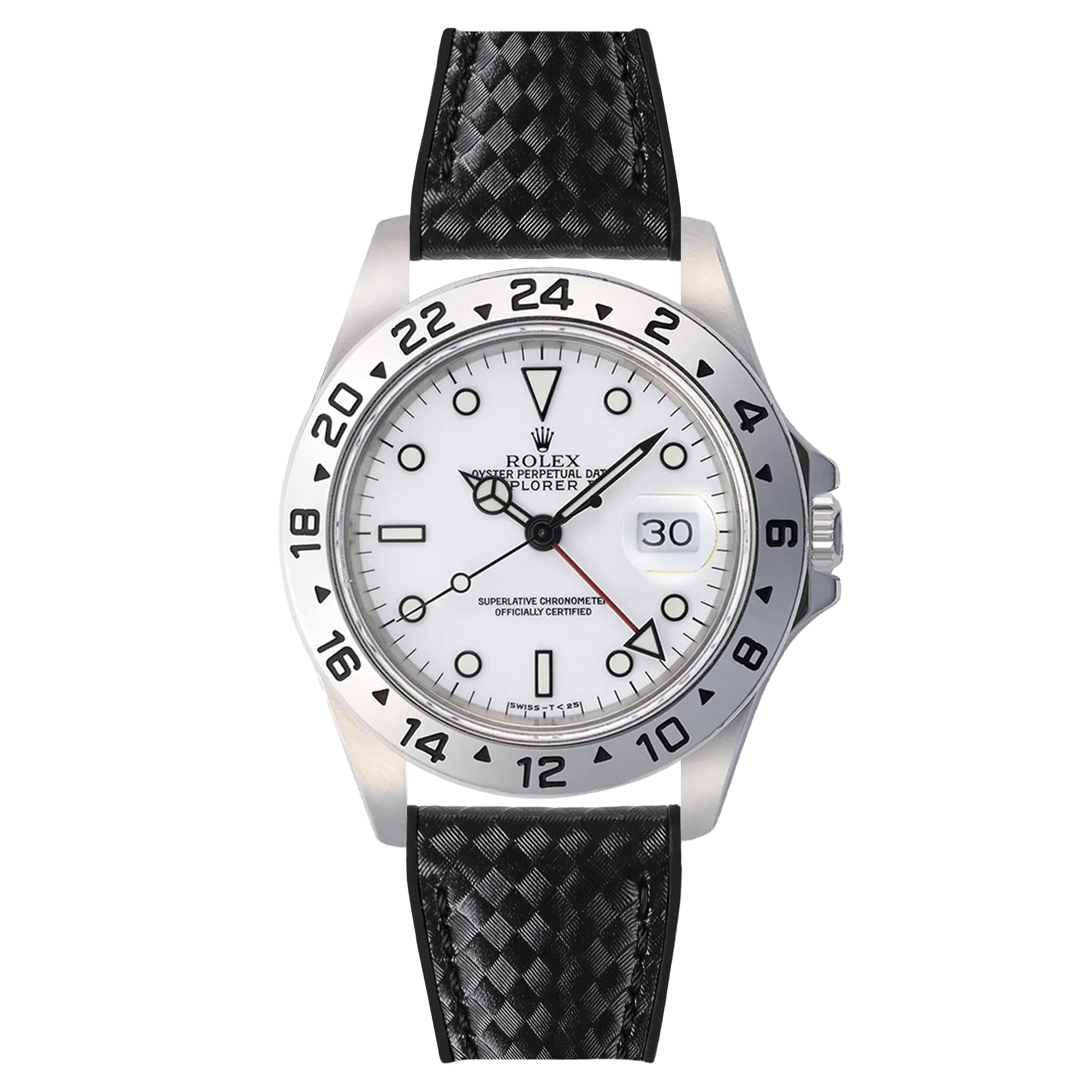 Elevate your Rolex Sea-Dweller 16600/16660 with the Ezra Performance Hybrid Strap, a striking fusion of sporty design and refined functionality. This strap seamlessly integrates a textured, patterned calfskin leather upper with a resilient FKM rubber core, creating a distinctive and durable accessory for your cherished timepiece.