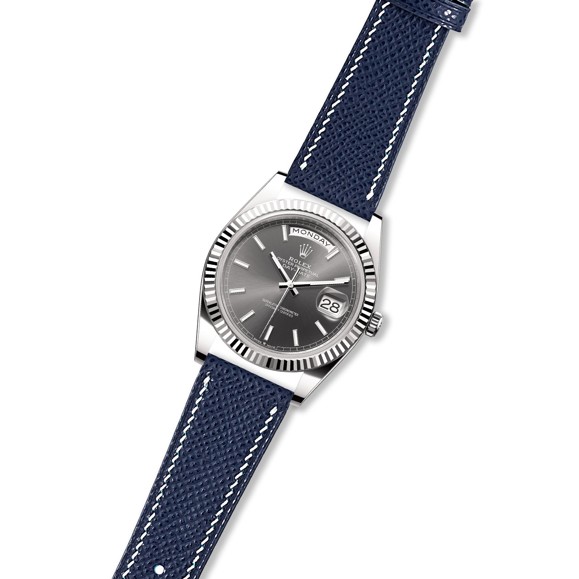 Elevate your Rolex Day-Date with the luxurious comfort and timeless style of our handcrafted Epsom calfskin leather watch strap. Sourced from the esteemed Tanneries Du Puy in France, this exceptional strap showcases a distinctive embossed hatch grain pattern and remarkable durability, making it a fitting complement to the prestigious Day-Date.