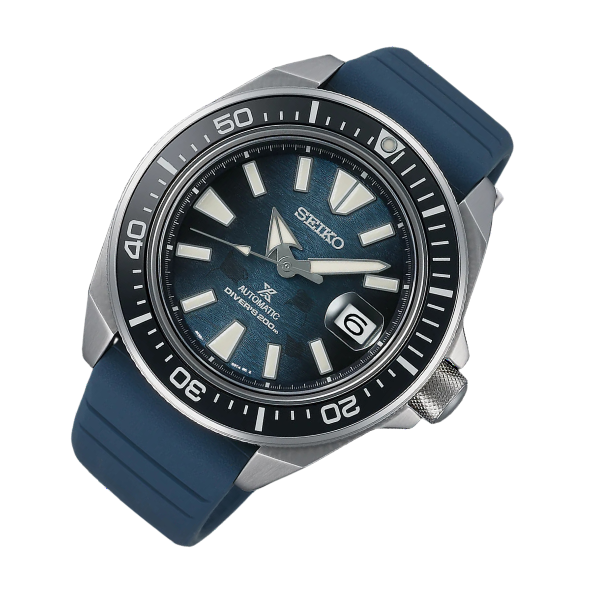 The Seiko Prospex King Samurai "Manta Ray" Save the Ocean Special Edition (SRPF79K1) is a dive watch that makes a statement both in style and commitment to the environment.  Its blue dial evokes the beauty of the ocean depths, while the powerful design of the King Samurai case ensures a bold presence on the wrist. This special edition timepiece features a comfortable silicone bracelet and is powered by a reliable automatic movement.  With 200m water resistance and a unidirectional rotating bezel, it's ready for underwater adventures.  By choosing this watch, you contribute to Seiko's Save the Ocean program, supporting marine conservation efforts worldwide.