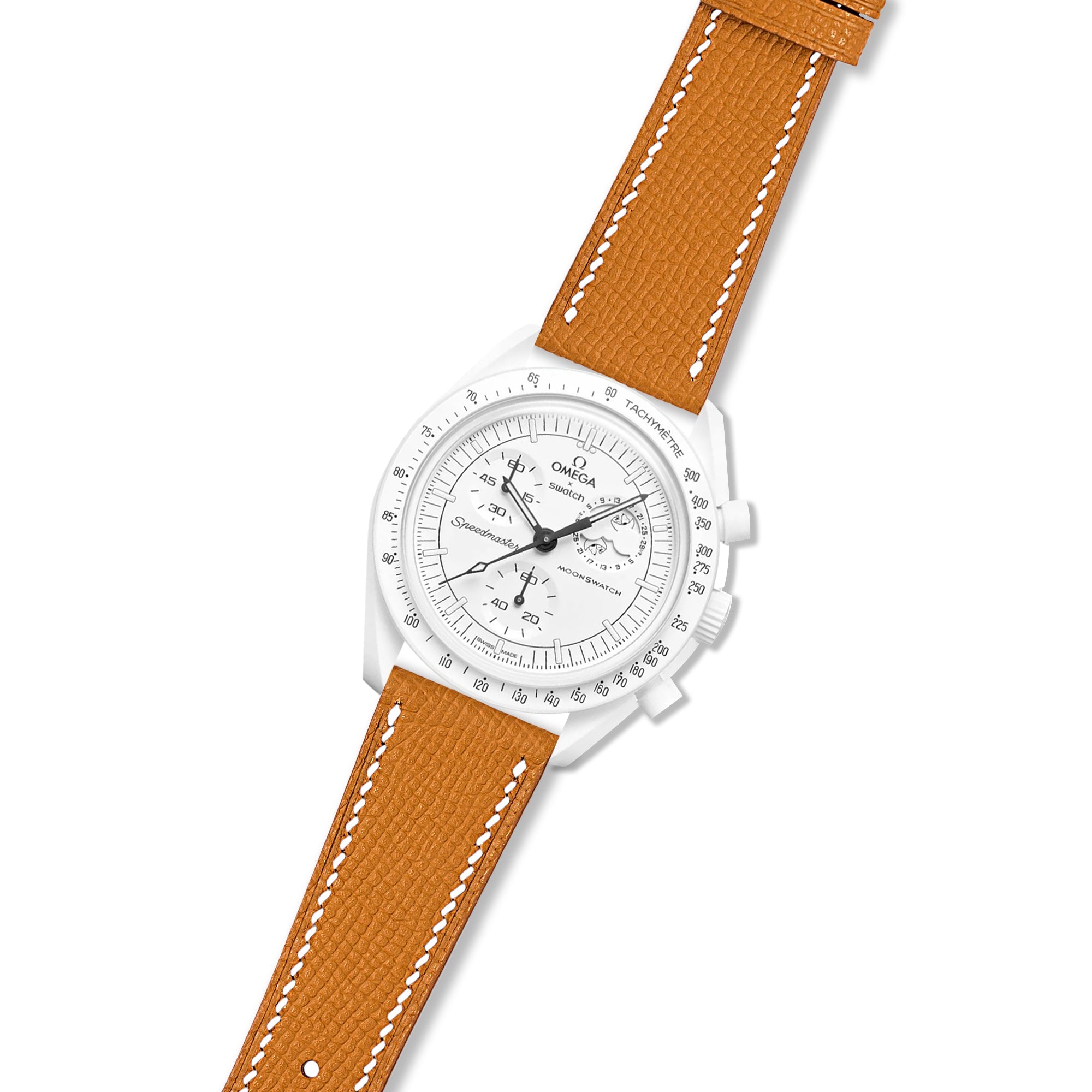 Elevate your Omega x Swatch Moonswatch Mission to the Moonphase - Full Moon with a touch of French elegance. Our Epsom Calfskin Leather Strap, handcrafted from premium leather sourced from the renowned Tanneries Du Puy, adds a sophisticated and refined touch to your Bioceramic timepiece.