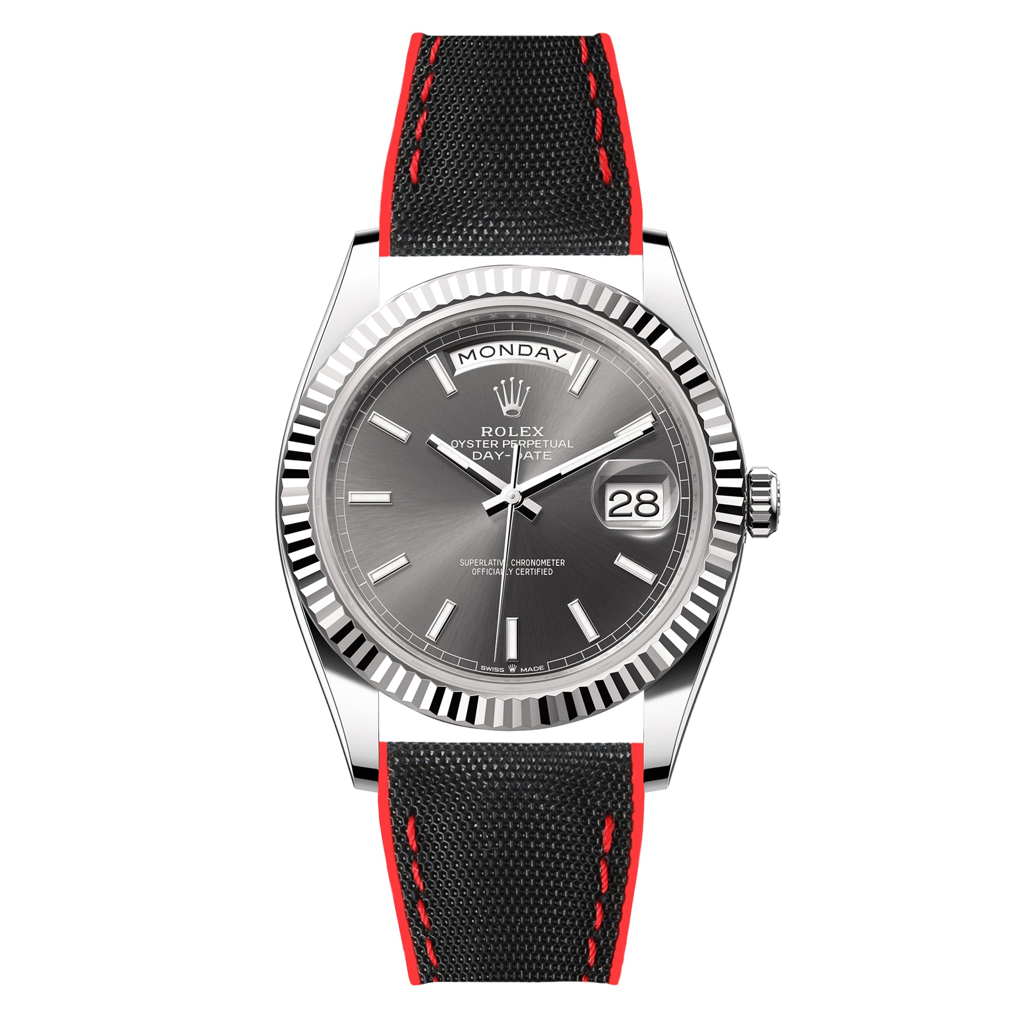 Elevate your Rolex Day-Date with the Luca Canvas Nylon Performance Strap, a perfect fusion of rugged durability and refined style. Designed for the modern adventurer, this strap seamlessly blends the timeless appeal of canvas nylon with the resilient performance of an FKM rubber core, creating a versatile and comfortable accessory for your cherished timepiece.