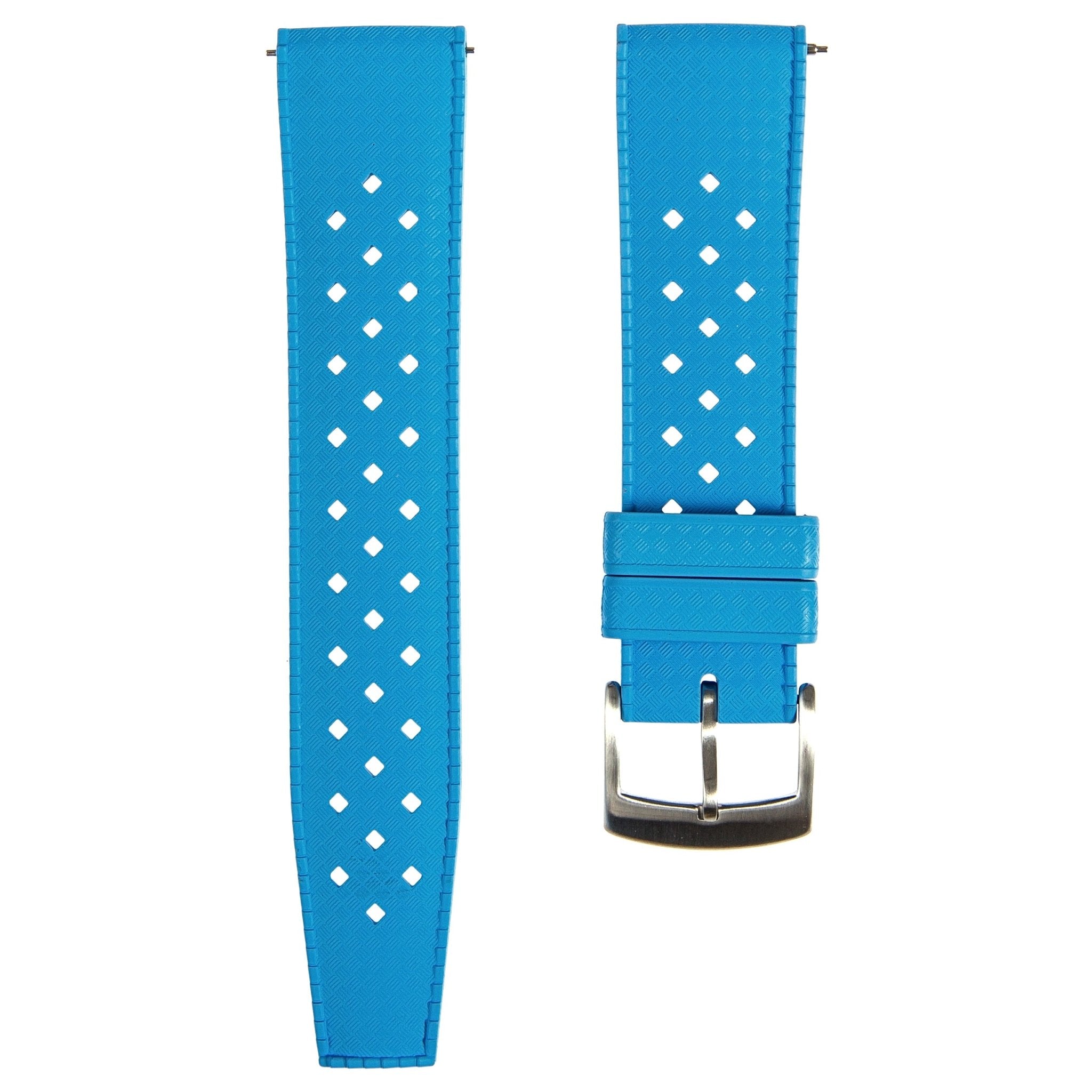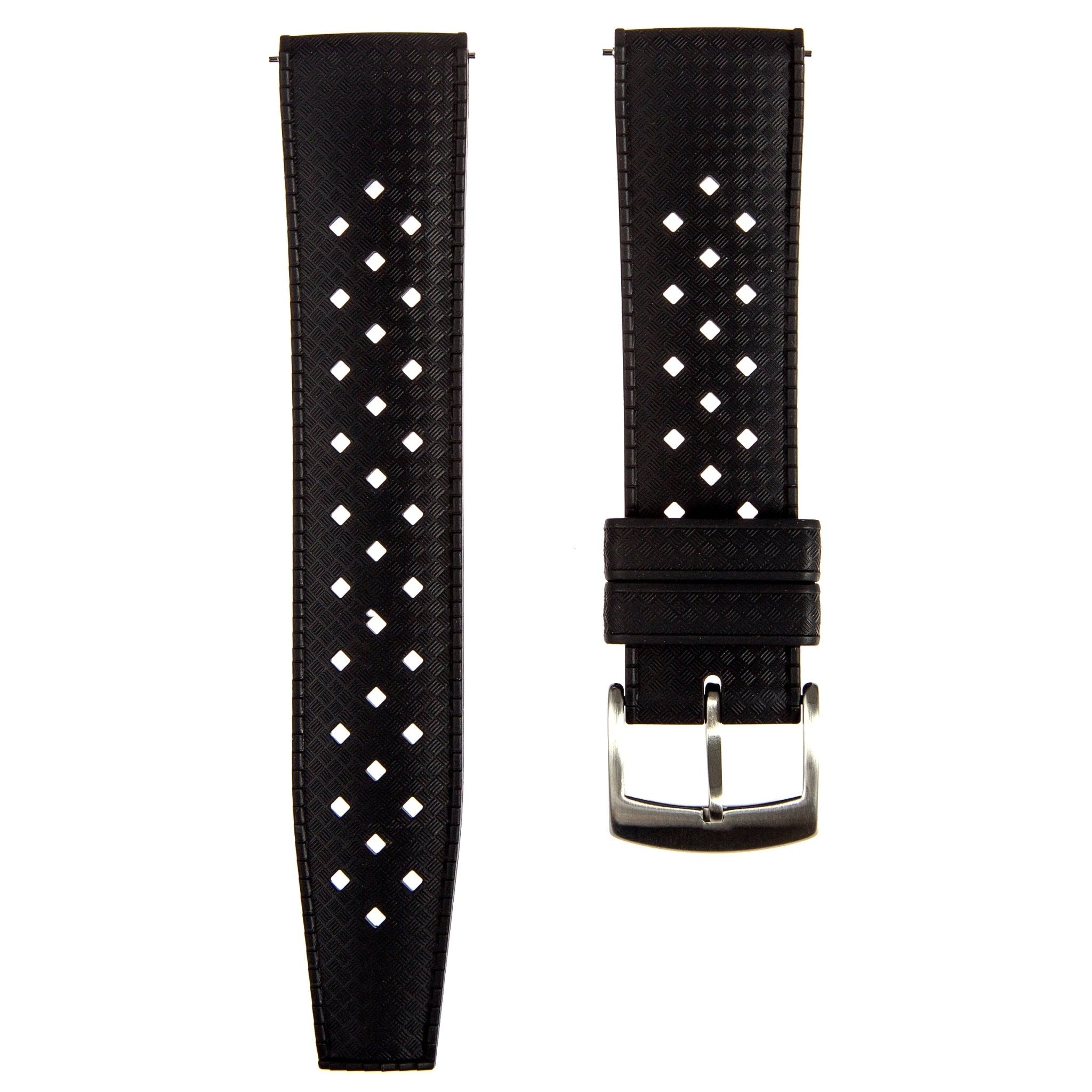Experience the iconic Ventilated watch strap, reimagined with modern materials and functionality. The Calypso Ventilated FKM Rubber Strap delivers the classic perforated design and breathable comfort of vintage dive watch straps, now with the unmatched durability and resilience of FKM rubber.