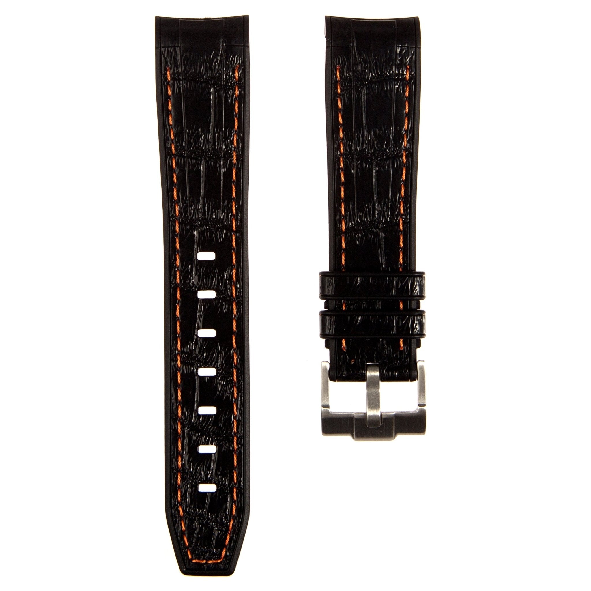 Embossed Alligator Curved End Premium Rubber Watch Strap for Omega x Swatch Moonswatch - Mission to the Moon - Black with Orange Stitch (2406)