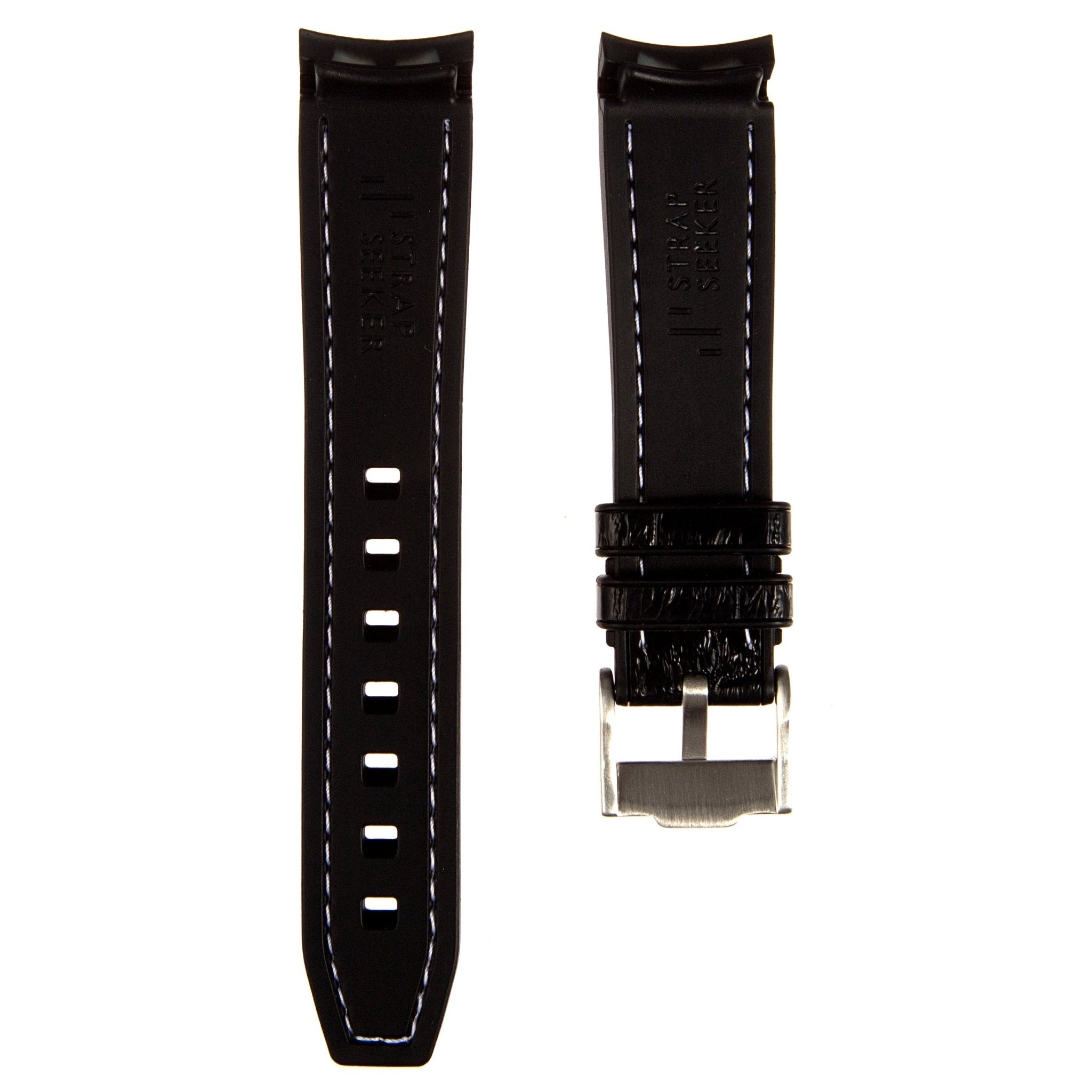 Embossed Alligator Curved End Premium Rubber Watch Strap for Omega Speedmaster Moonwatch - Black with White Stitch (2406)