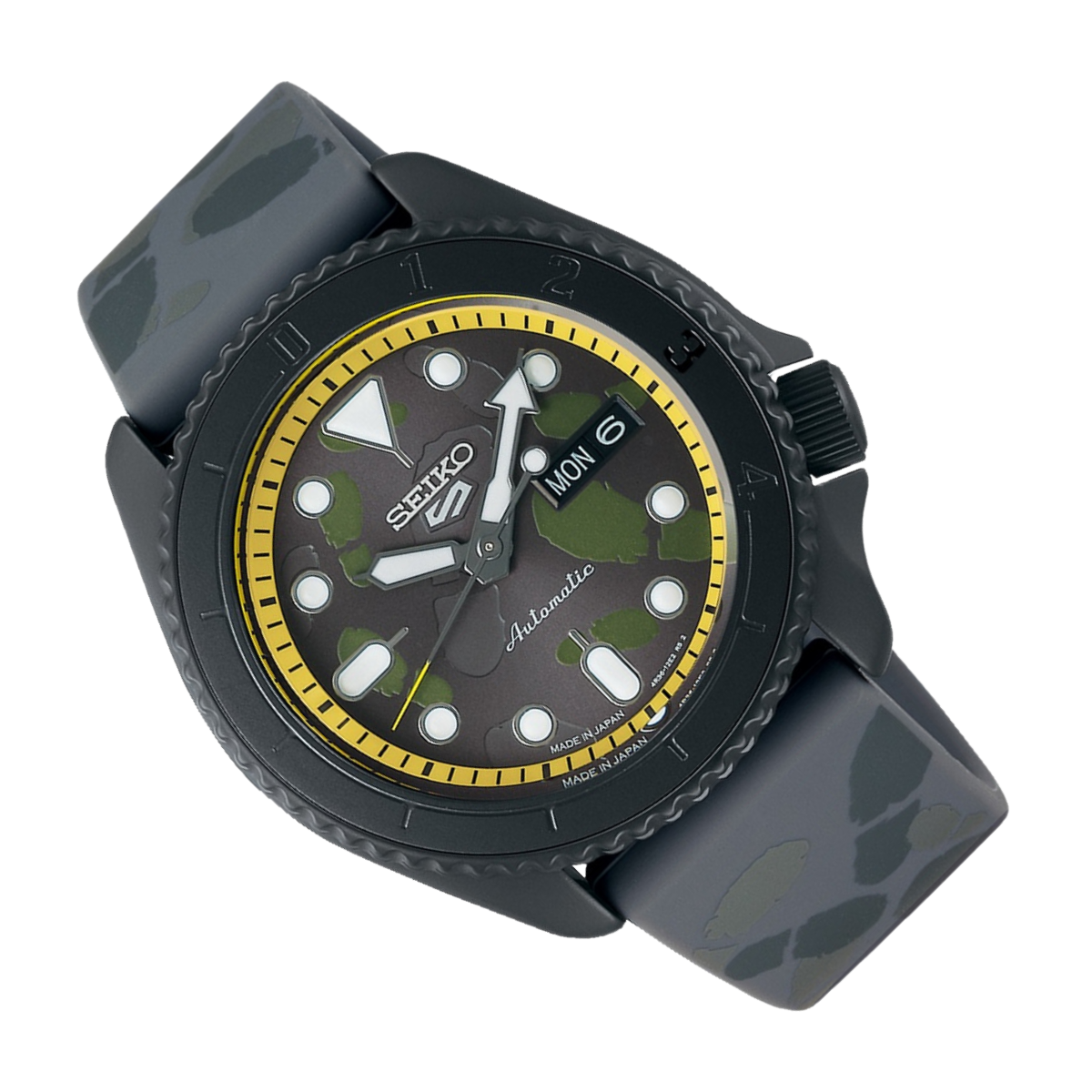 The Seiko 5 Sports One Piece Sanji Limited Edition (SRPH69K1) is a stylish and functional watch designed for fans of the popular anime. This special edition timepiece boasts a vibrant design and a robust construction, perfect for everyday wear. Powered by an automatic movement, it offers a 41-hour power reserve and a convenient day/date display. The watch features a durable stainless steel case, a comfortable silicone strap, and a unidirectional rotating bezel. With 100m water resistance, it's suitable for various activities.  The limited-edition caseb