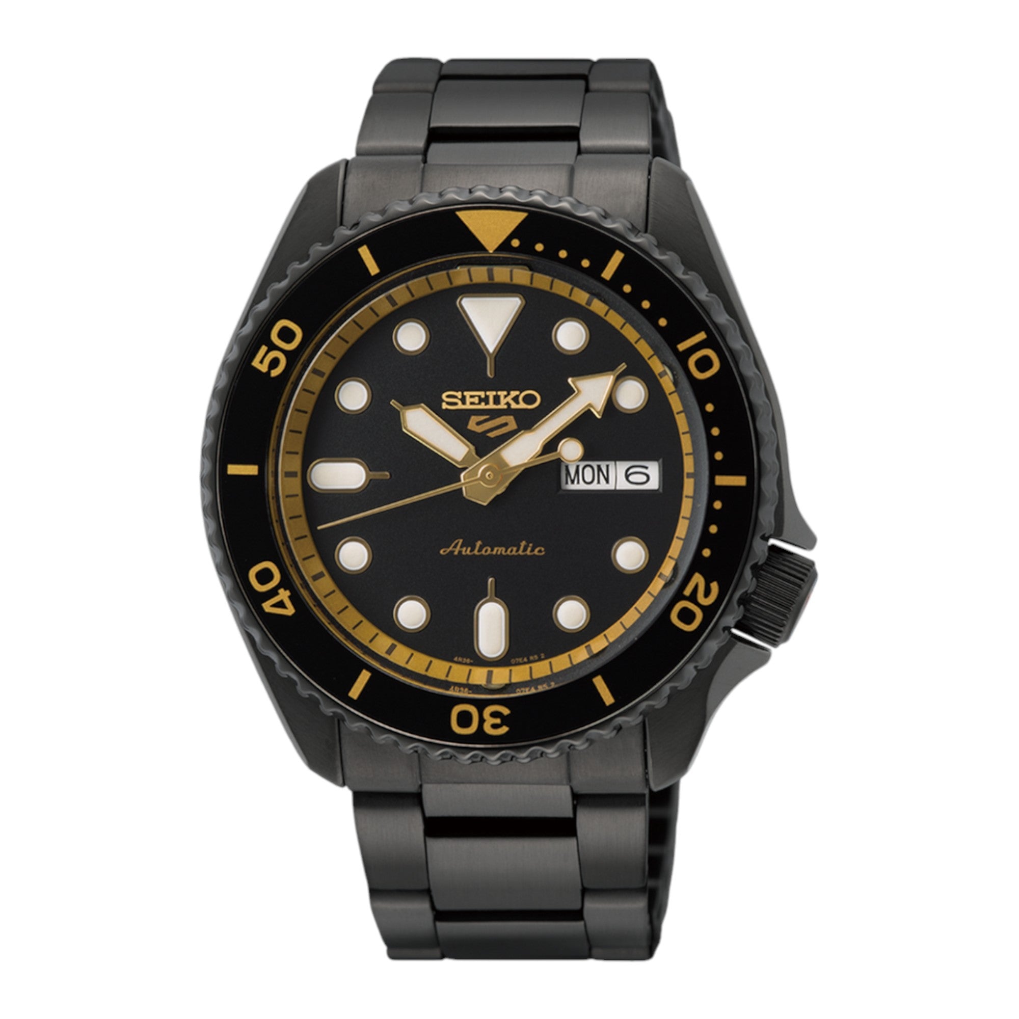 The Seiko 5 Sports Supercars SRPJ01K is a limited edition watch that combines sporty style with collectable appeal.  This eye-catching timepiece features a black dial with contrasting victory gold accents, creating a bold and dynamic look. The Supercars logo on the crown and case back adds a unique touch, making it a must-have for fans of motorsports.  With its durable construction and reliable automatic movement, the SRPJ01K is a stylish and functional watch that will be treasured for years to come.
