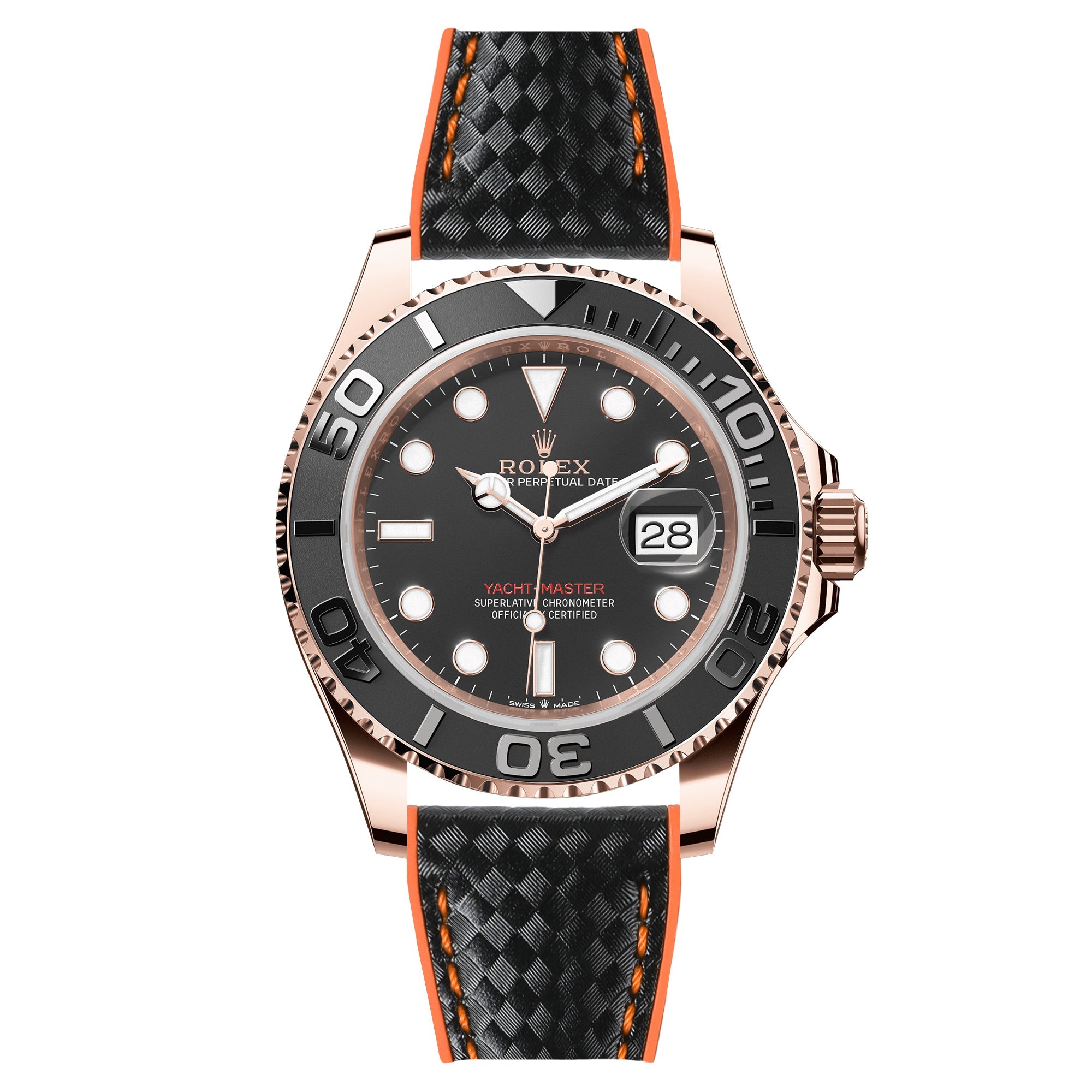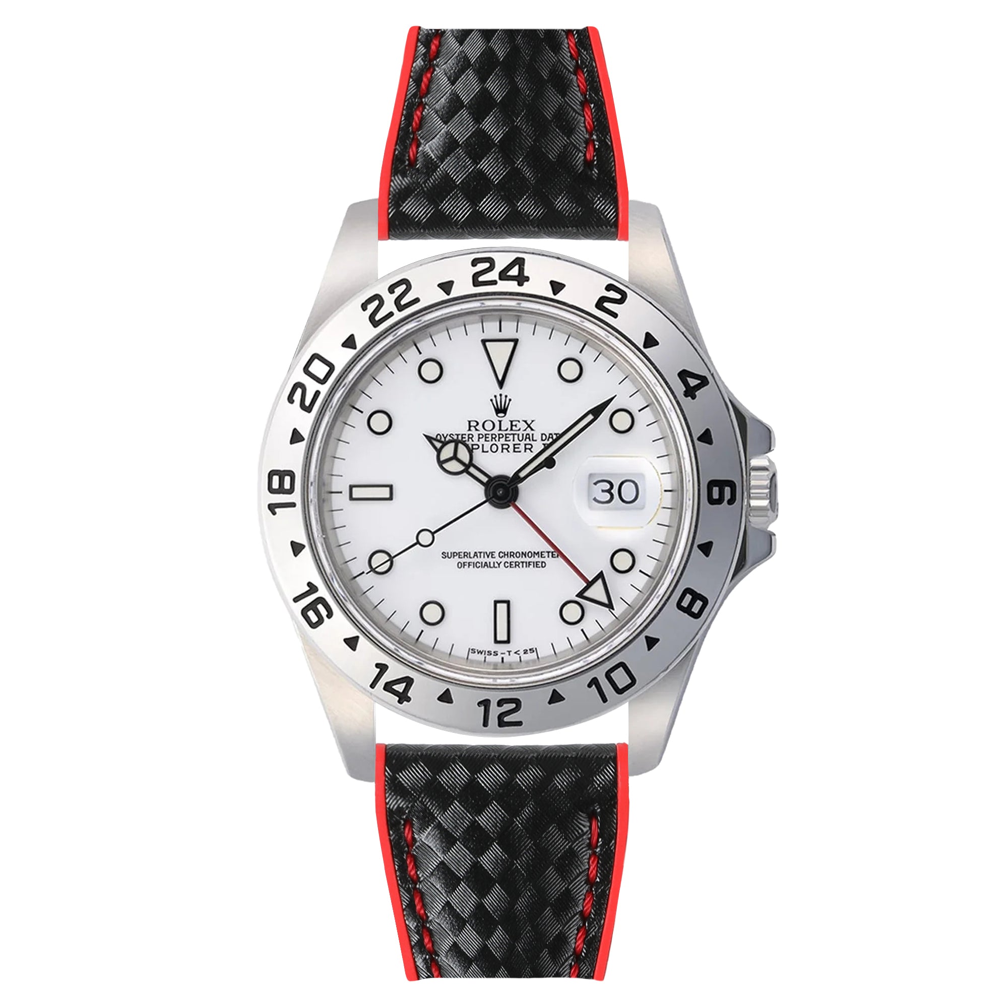 Elevate your Rolex Datejust with the Ezra Performance Hybrid Strap, a striking fusion of sporty design and refined functionality. This strap seamlessly integrates a textured, patterned calfskin leather upper with a resilient FKM rubber core, creating a distinctive and durable accessory for your cherished timepiece.