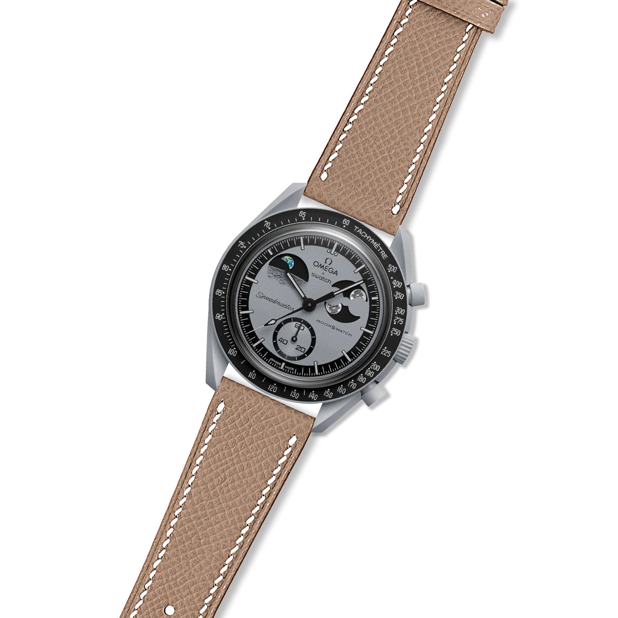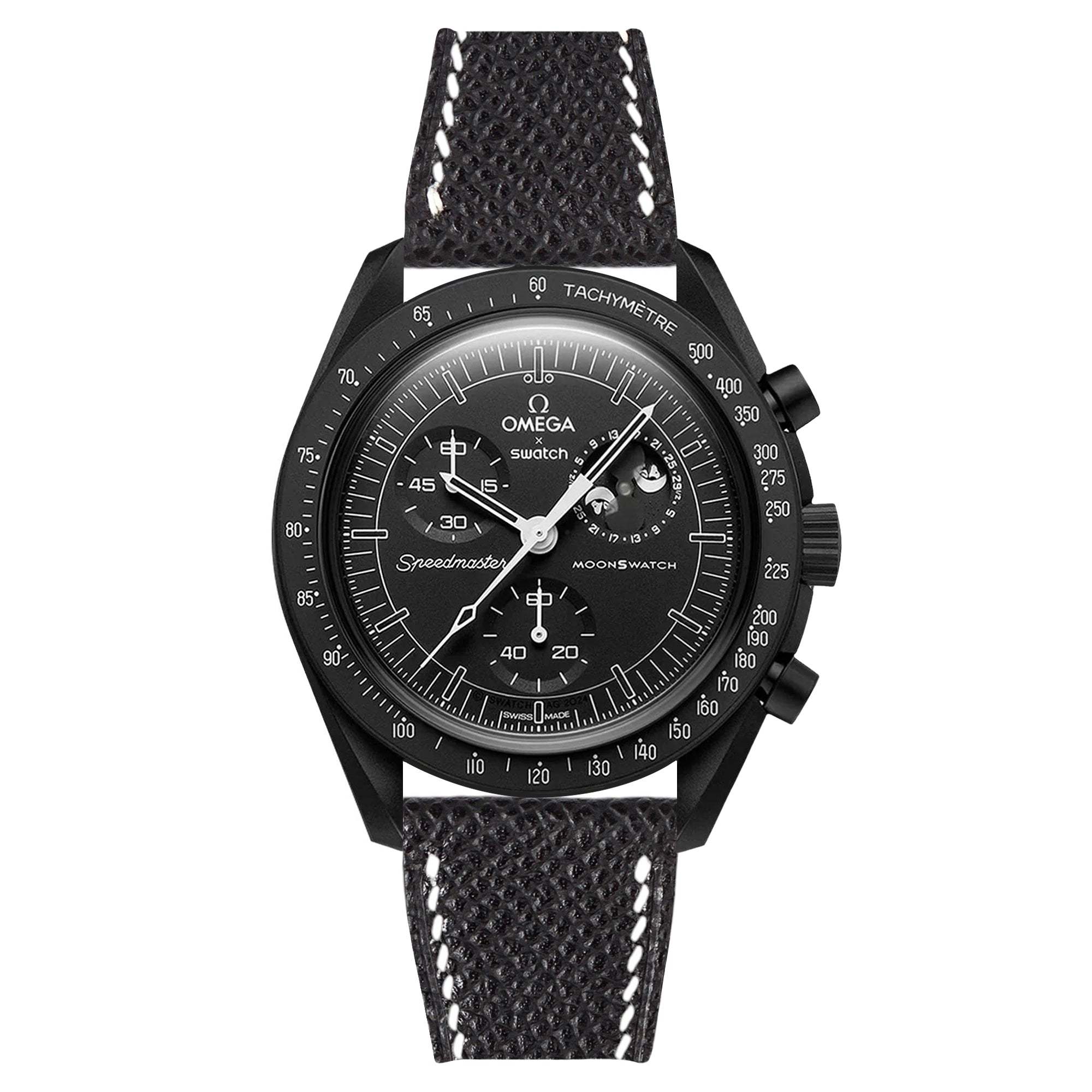 Elevate your Omega x Swatch Moonswatch Mission on Earthphase with a touch of French elegance. Our Epsom Calfskin Leather Strap, handcrafted from premium leather sourced from the renowned Tanneries Du Puy, adds a sophisticated and refined touch to your Bioceramic timepiece.