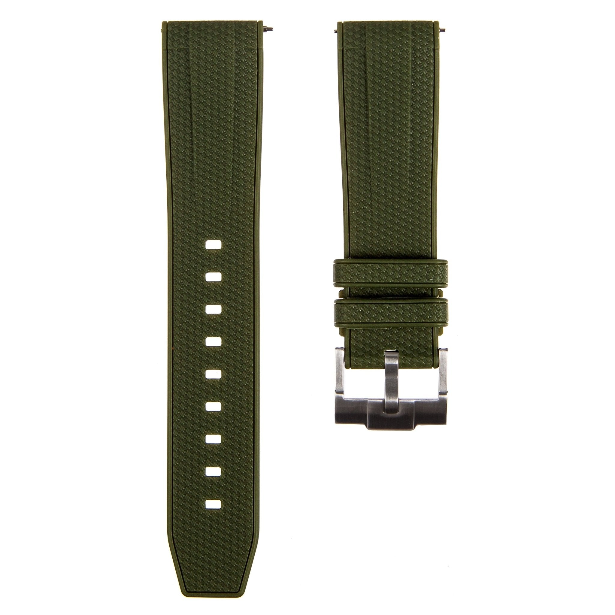 Experience refined comfort and timeless style with our Flexweave Silicone Watch Strap. Its subtle weave and ridges add a delightful touch of texture that elevates both the look and feel of your timepiece. Crafted from velvety-smooth liquid silicone rubber, this strap provides long-lasting comfort and resilience to withstand your active lifestyle. Quick-release spring bars allow for effortless strap changes, while the durable stainless steel buckle adds a polished finishing touch. Upgrade your watch with the perfect blend of elegance and practicality.