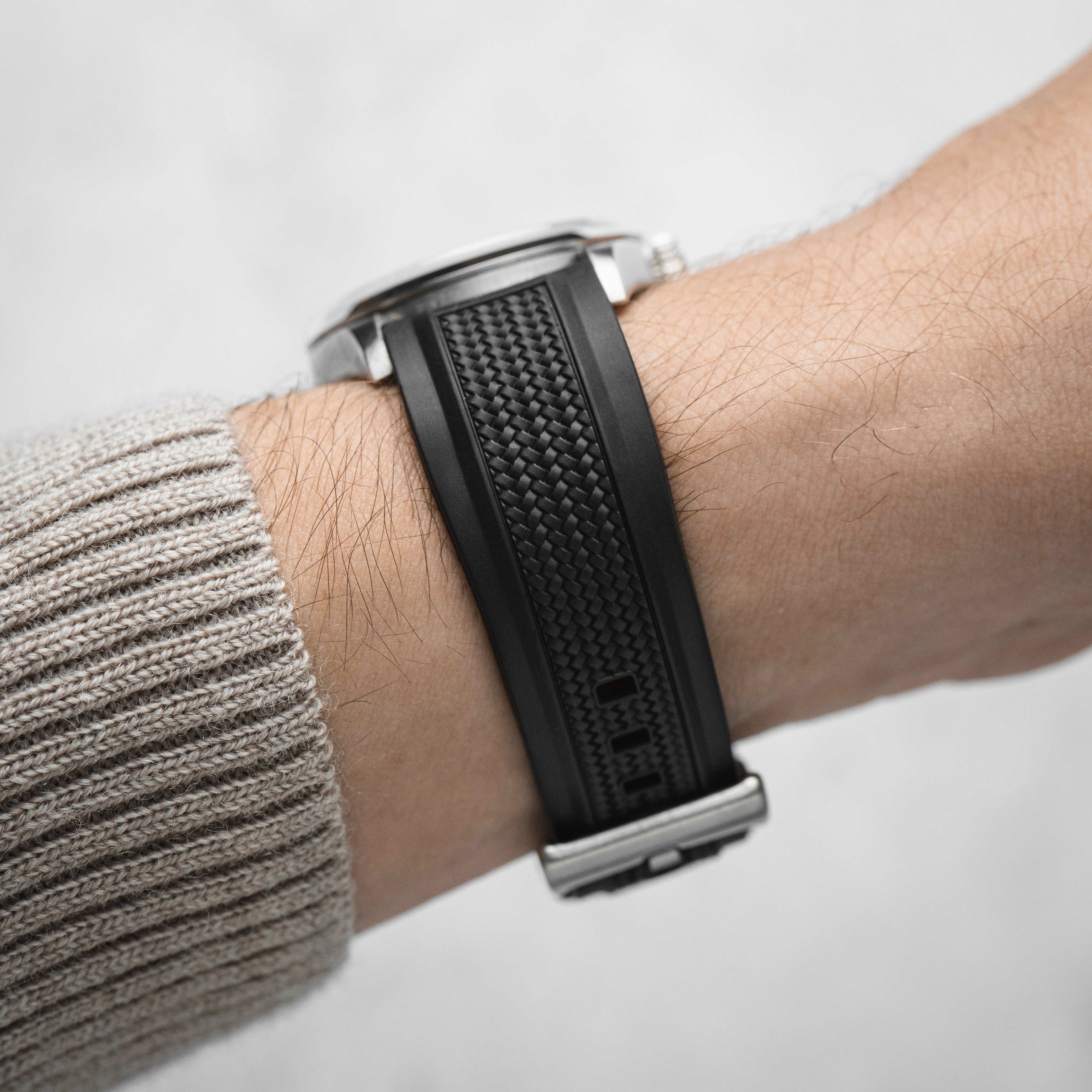 Premium Silicone Rubber: Crafted from liquid silicone rubber, this strap is velvety smooth on the skin while providing a durable shield against daily wear and tear. Perfect for active users, it combines tactile comfort with a robustness that stands up to water, sweat, and sun.