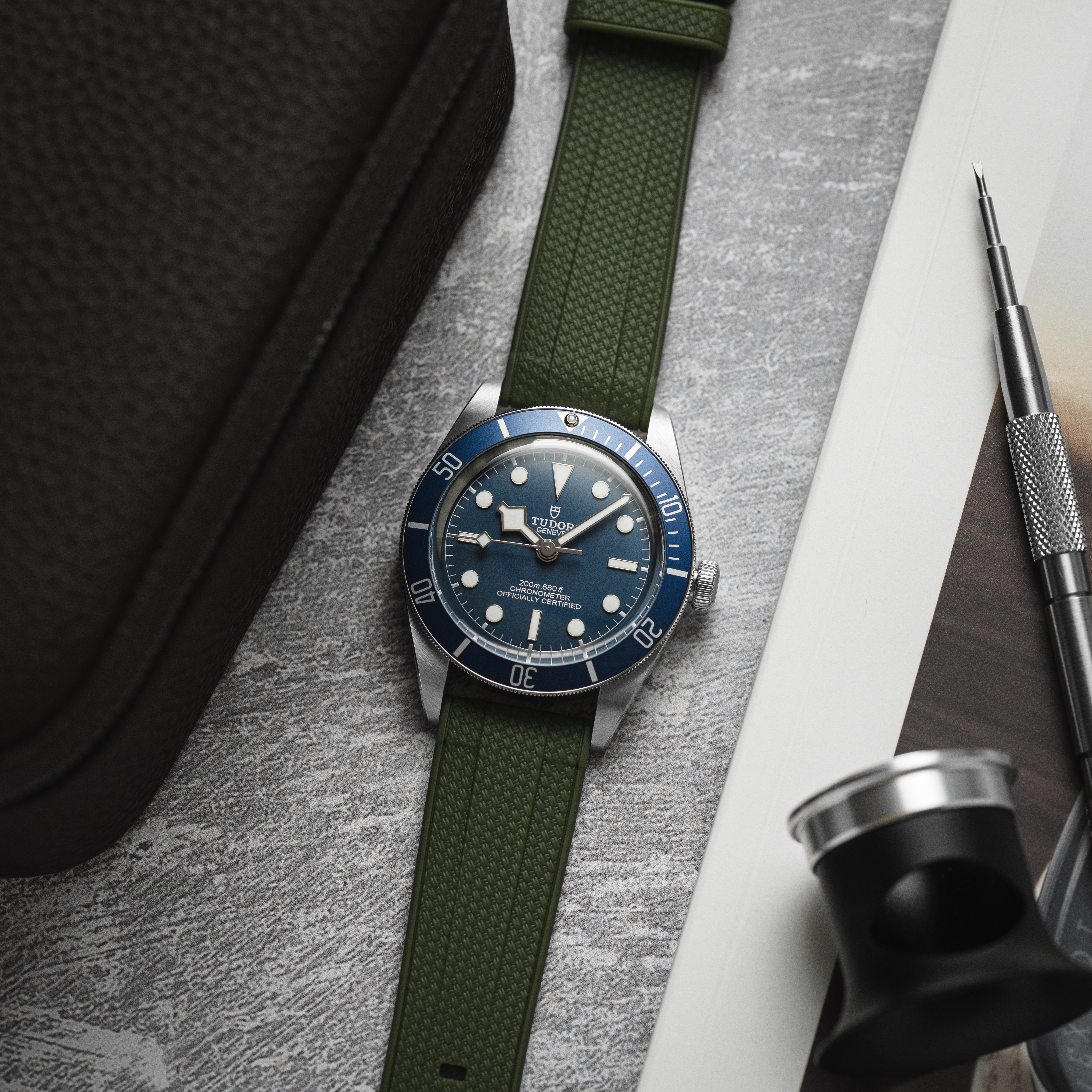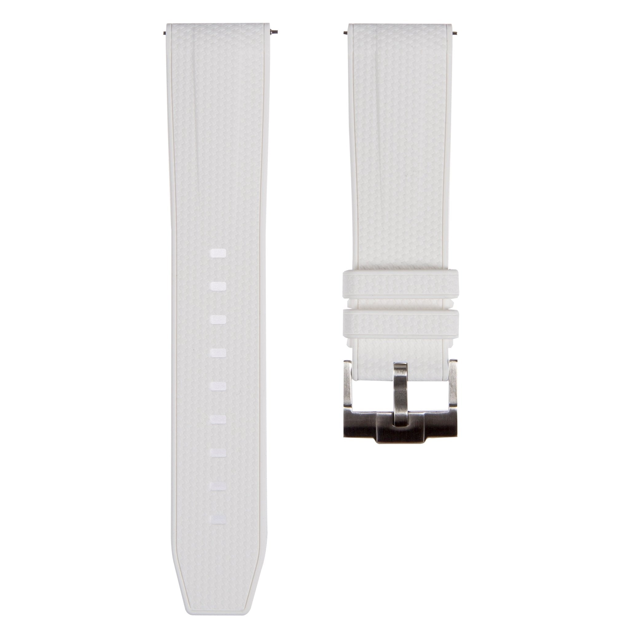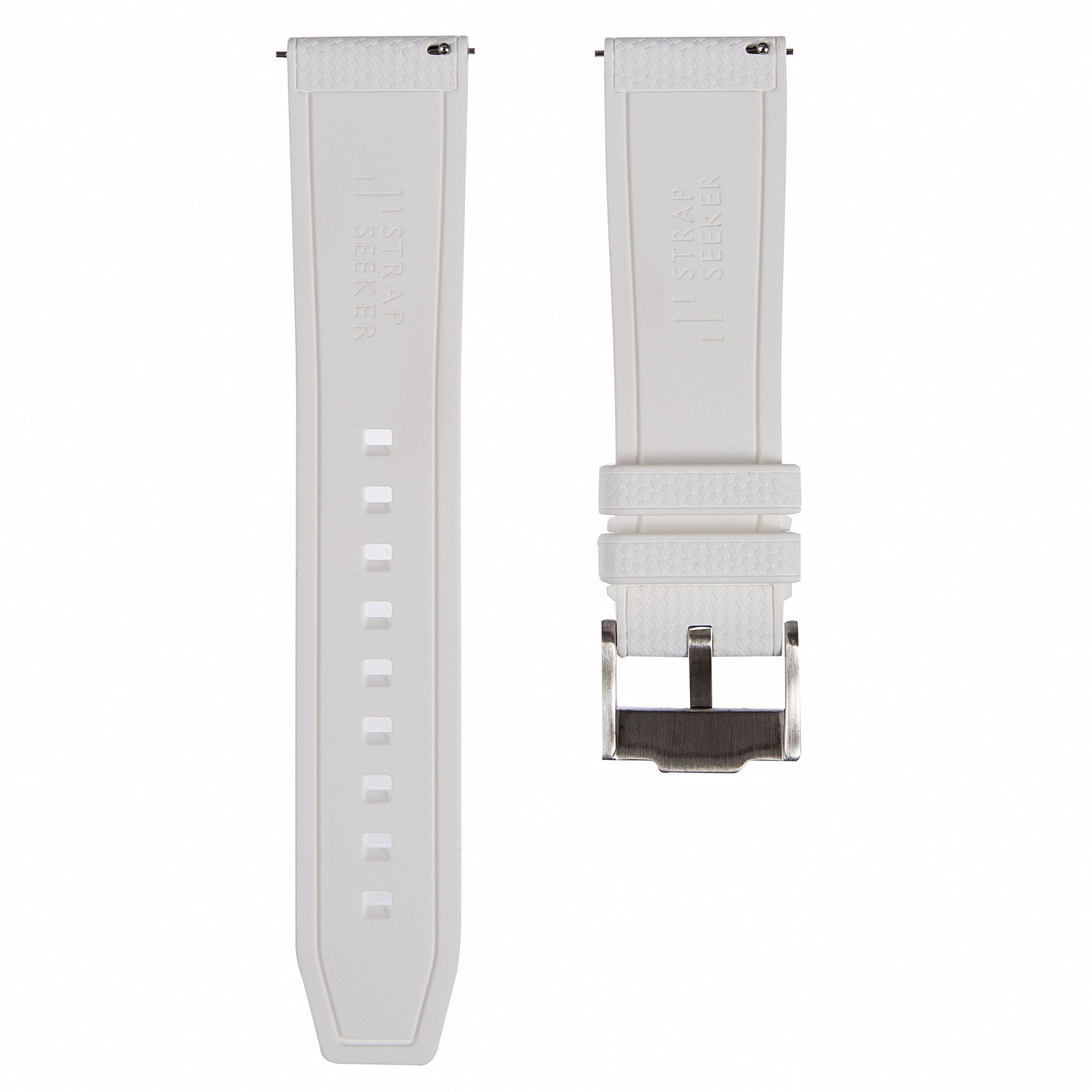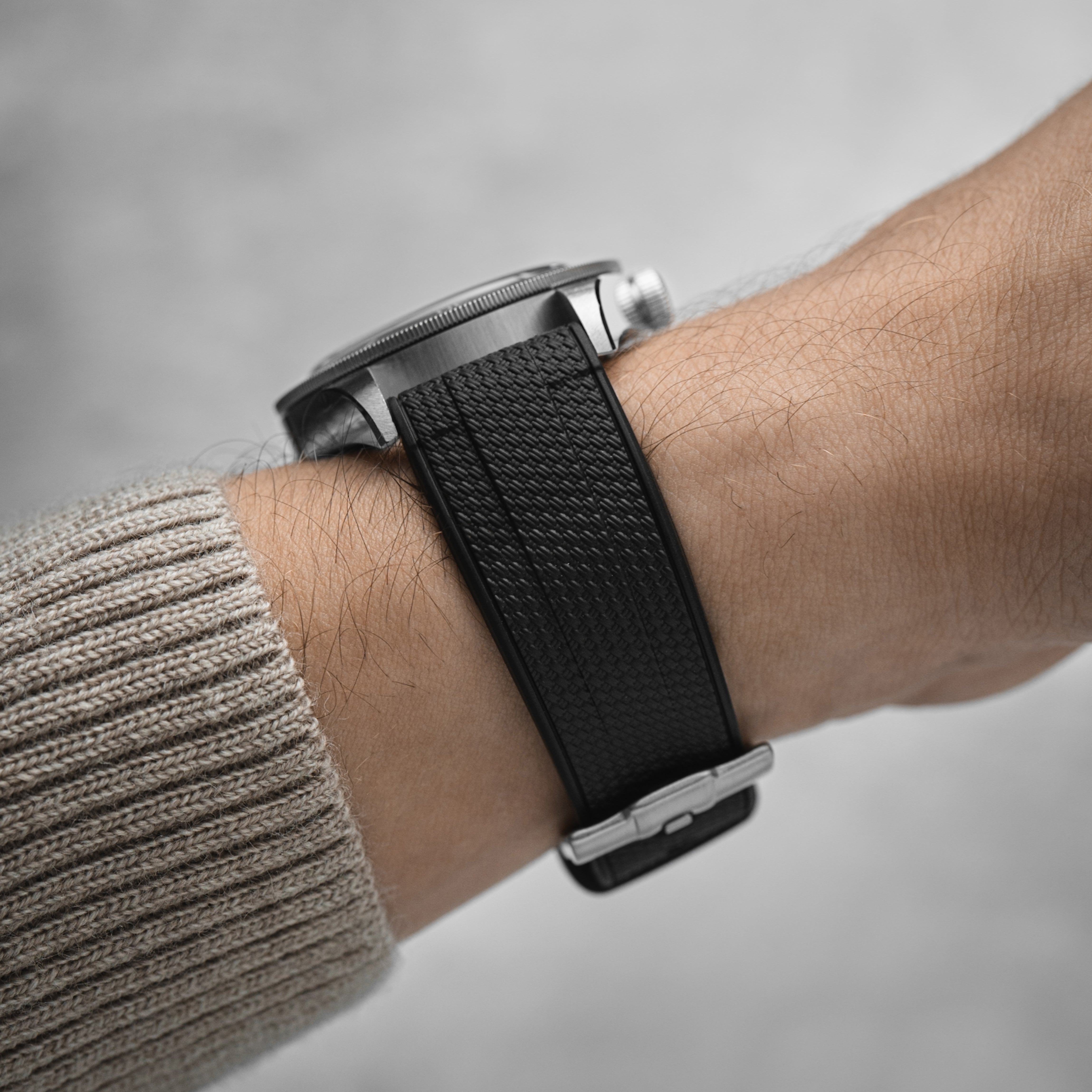 Experience refined comfort and timeless style with our Flexweave Silicone Watch Strap. Its subtle weave and ridges add a delightful touch of texture that elevates both the look and feel of your timepiece. Crafted from velvety-smooth liquid silicone rubber, this strap provides long-lasting comfort and resilience to withstand your active lifestyle. Quick-release spring bars allow for effortless strap changes, while the durable stainless steel buckle adds a polished finishing touch. Upgrade your watch with the perfect blend of elegance and practicality.