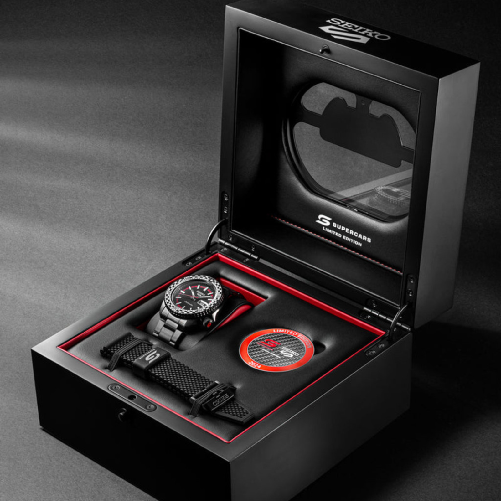 ignite your passion for motorsport with the Seiko 5 Sports Supercars Limited Edition 2024 SRPL01K. Limited to just 2,024 pieces, this exclusive men's automatic watch boasts a dynamic black dial reminiscent of racetrack asphalt. The bezel proudly features a bold checkered flag pattern, while red accents echo the Supercars series. Crafted from black-coated stainless steel and accompanied by both a matching steel bracelet and an additional silicone strap, this timepiece embodies speed and precision.